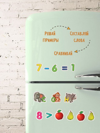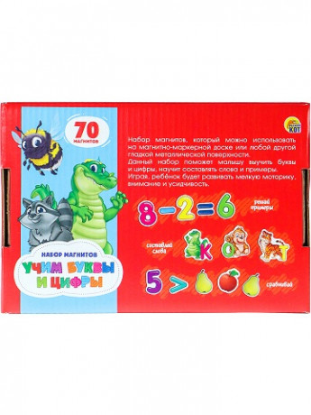 Учим буквы и цифры Набор магнитов, который можно использовать на магнитно-маркерной доске или любой другой гладкой металлической поверхности. Данный набор поможет малышу выучить буквы и цифры, научит составлять слова и примеры. Играя, ребёнок будет развивать мелкую моторику, внимание и усидчивость. Возраст: 3+.