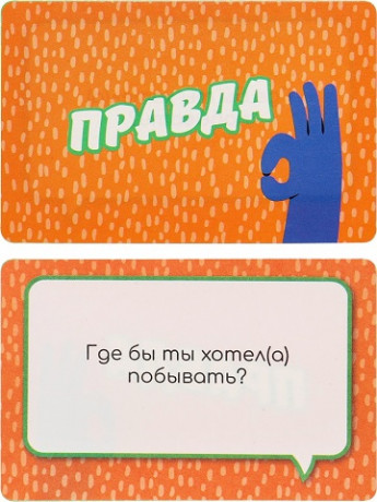 Игра для смелых и отвязных. Отвечайте на каверзные вопросы либо совершайте отчаянные и забавные поступки. Состав игры: 55 карточек. Количество игроков: 2+. Возраст: 12+.