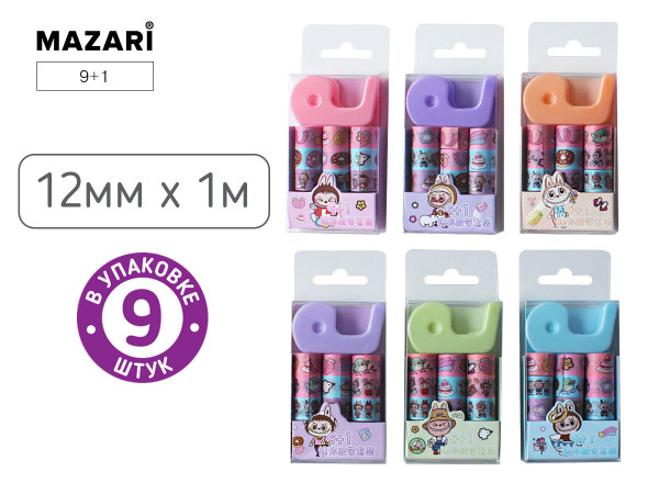 Набор клейких декоративных лент 1 см х 2,5 м. MAZARI КОТИКИ 12 шт., диспенсер M-1555/1/36 M-1555/1/36