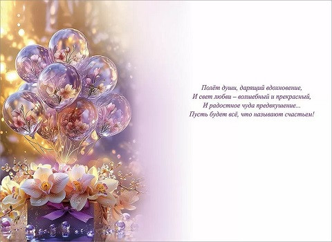 Поздравительная открытка среднего формата - идеальное решение для подарка! Размеры -126х182. Внутри - поздравительное стихотворение. Украшенная мерцающими радужными блестками в лаке, поздравительная открытка выглядит очаровательно и привлекает внимание. Изделие изготовлено из прочного материала, который хорошо держит форму. Открытка не помнется при транспортировке и использовании. Сверху на картонную основу нанесено четкое полноцветное изображение. Благодаря высокому качеству печати и защитному покрытию краски не выцветут, и открытка на праздник будет радовать адресата многие годы. Количество экземпляров в одной упаковке — 10 штук.