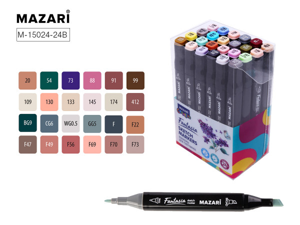 Маркеры для скетчей Nora! торговой марки SKYGLORY на спиртовой основе имеют два наконечника: скошенный 6 мм и пулевидный 1 мм. Корпус пластиковый, трехгранный. Поставляются в картонной коробке по 24 штуки. Ассортимент цветов в коллекции - 81.