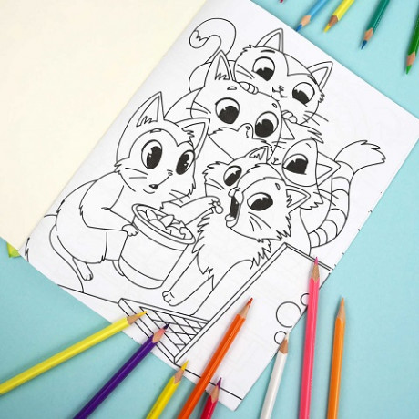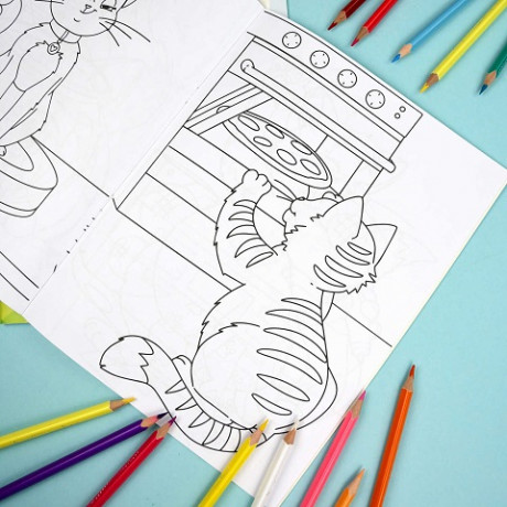 Что делает твой кот, когда тебя нет дома? Спит весь день или смотрит без тебя новые серии мультфильмов? Давай узнаем! Скорее бери карандаши и раскрашивай забавные проделки пушистых питомцев.