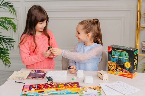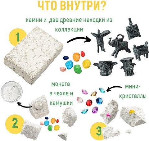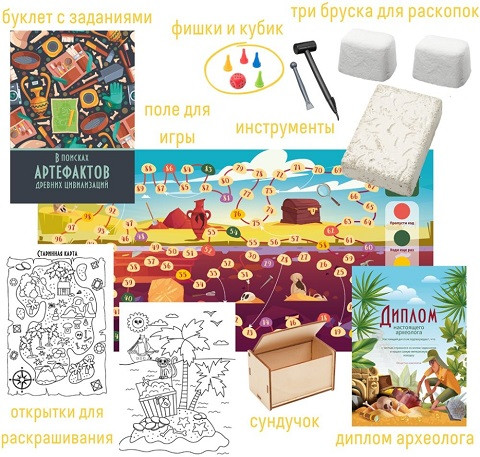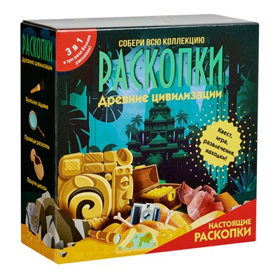 Набор для раскопок «Древние цивилизации» обязательно понравится любителю тайн и загадок. Юному археологу предстоит не только сыграть в игру-ходилку и совершить путешествие по древнему миру, но и провести настоящие раскопки. В трёх брусках спрятаны необычные находки и сокровища. В книге с квестом археолога ждут множество интересных загадок. В наборе также есть две открытки-раскраски, которые можно подарить близким. В конце путешествия ребёнок получит именной диплом настоящего археолога. В наборе есть всё необходимое для игры – ничего докупать не нужно. Раскопки можно производить с помощью прочных инструментов из набора, а затем складывать их в специальный сундук для сокровищ. Набор для раскопок «Древние цивилизации» — это отличный подарок, который не только развлечёт ребёнка, но и вызовет у него интерес к истории. В наборе: буклет с заданиями, настольная игра, кубик, фишки, три бруска для раскопок, инструменты для раскопок, сундучок для сокровищ, диплом кладоискателя, открытки-раскраски. Цвета находок в ассорт