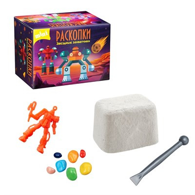 Брусок в этом мини-наборе для раскопок хранит в себе тайны космических сражений. Внутри коробочки вы также найдёте прочный инструмент с удобным наконечником и инструкцию — ребёнку будет легко отыскать разноцветных космических захватчиков. С фигурками можно играть, также их можно использовать как брелок — в каждой есть отверстие для нитки. Брусок для раскопок можно при необходимости смочить водой. Каждый археологический набор из нашего ассортимента содержит в себе элемент сюрприза, ведь до начала раскопок неизвестно, что внутри. Именно поэтому дети так обожают раскопки! В наборе: брусок с находками внутри, палочка для раскопок. Цвета находок в ассортименте