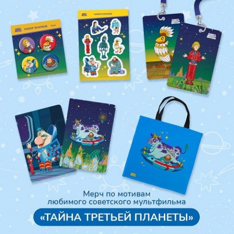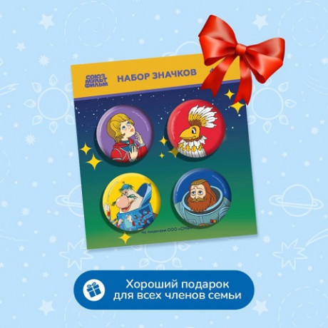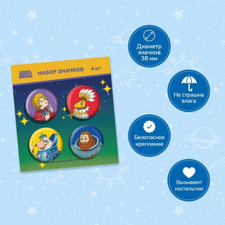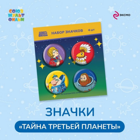Космический набор значков 4 шт. по научно-фантастическому мультфильму «Тайна третьей планеты». Большие и маленькие любители далеких-далеких галактик останутся в восторге. Внимание! Набор значков вызывает ностальгию. Рекомендуем дарить детям и взрослым всех возрастов. Диаметр металлических закатных значков 3,8 см. Благодаря удобной булавке значки безопасно крепятся на рюкзак и одежду.