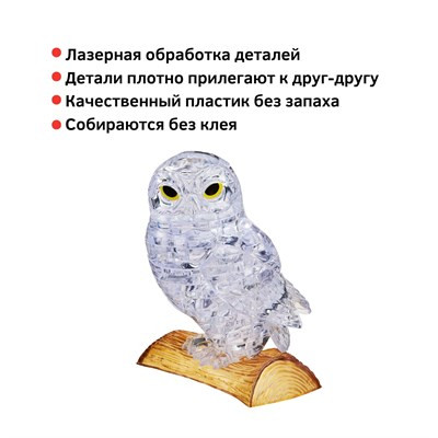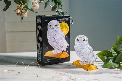 Знали ли вы, что совы могут поворачивать голову на 270 градусов? 3D-пазл Crystal Puzzle «Полярная сова» похож на обычный пазл, только все детали в нём — объёмные. Соберите красивую фигурку совы на ветке из 42 полупрозрачных элементов. В наборе есть подробная инструкция, где детали изображены по порядку сборки. В конце фигура закрепляется штифтом и становится прочной, клей не понадобится. Можно собирать без инструкции, если хочется испытать себя. Дополнительно в наборе есть наклейки. Crystal Puzzle — бренд из Гонконга, ассортимент которого постоянно пополняется новинками. Детали пазла упакованы в плотный пакет, поэтому не потеряются и не сломаются. Такой пазл станет необычным подарком каждому любителю сов! В наборе: 42 детали пазла, инструкция на русском языке, наклейки Высота готовой фигуры: 9 см Сложность: **