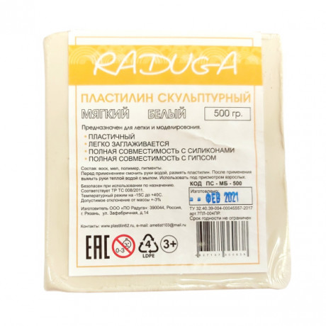 Пластилин скульптурный 500 гр. Радуга мягкий, белый ПСРЭ-БМ-500/1 ПСРЭ-БМ-500/1