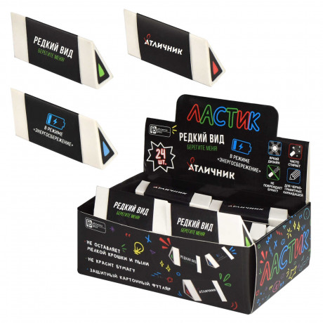 Ластик , арт.67764/ 24 ФРАЗЫ С ХАРАКТЕРОМ (шоу-бокс, 24 шт., ассорти, чёрный, белый, 18х25х64 мм, термопластичная резина, рисунок внутри ластика, форма: треугольная, картонная обертка).