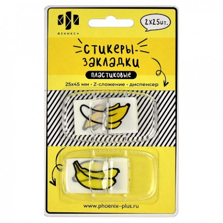 Закладки 25х45мм. 50л. 2бл. пластик, ассорти Феникс+ "БАНАН" 65197/1/48/384