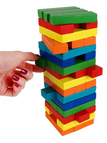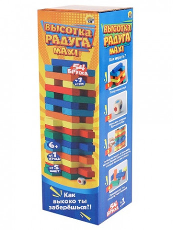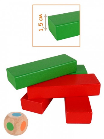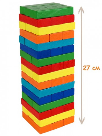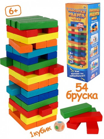 Игра "высотка" подойдет для интересного досуга любой компании! Правила очень простые: 1. построить высотку 2. по очереди бросать кубик 3. вытаскивать бруски выпавших цветов и ставить их на верх башни 4. проигрывает тот, кто разрушит башню Башня сделана из натуральной древесины, поэтому отлично подойдет для развития мелкой моторики у детей. В комплект входит 54 элемента, размер каждого бруска: 15х25х75 мм. Высота башни: 27 см. В коробке.