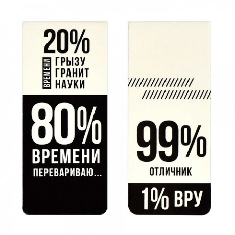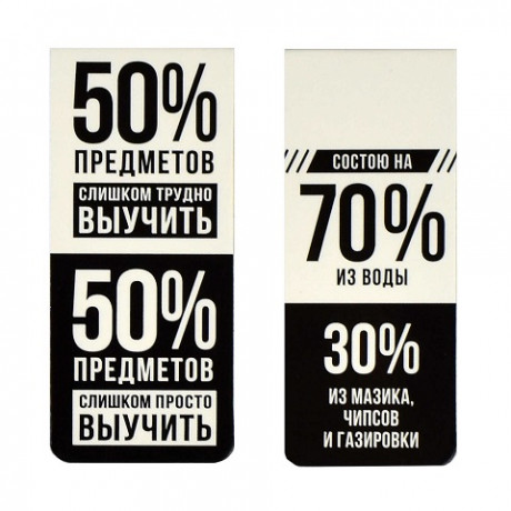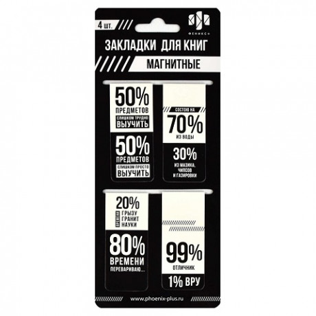 Набор закладок магнитных для книг арт. 67748 / 100 ПРОЦЕНТЫ (4 шт. в наборе, размер 25х58 мм, материал: мелованная бумага, ферроагломерированный полимер; цвет: чёрный, белый, декор: полноцветный дизайн, особенности: глянцевая ламинация, индивидуальная упаковка: подложка с европодвесом из мелованного картона + ПЭТ-пакет)