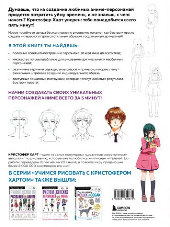Пять минут — именно столько времени тебе понадобится на создание своего уникального персонажа в стиле аниме! Не веришь? Спроси у Кристофера Харта! Фанат аниме, один из самых популярных художников и автор книг-бестселлеров по рисованию, которые уже помогли миллионам читателей по всему миру, расскажет и покажет тебе, как экономить время и силы при создании персонажей, вместе с тем придавая изюминку их образам. Под одной обложкой собраны советы и шпаргалки по всем ключевым этапам создания аниме-героя: строению тела, выражению самых разных эмоций, рисованию стильного аниме-образа, причесок и многое другое! Все это поможет тебе создавать абсолютно разных и непохожих друг на друга персонажей, а забавные комментарии и шутки автора не дадут заскучать. Начни создавать своего аниме-персонажа и преврати его в настоящую личность со своей уникальной историей уже сейчас!