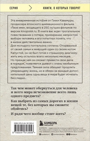 Международный феномен, проданный тиражом более двух миллионов экземпляров! Это согревающая, забавная и глубокая книга о смысле жизни. Дни молодого почтальона сочтены. Оторванный от своей семьи и живущий один с со своим котом Капустой, он не был готов к страшному диагнозу: жить ему осталось всего несколько месяцев. Но прежде чем он сможет привести свои дела в порядок, появляется дьявол с очень необычным предложением. Темная сила обещает продлить умирающему жизнь, но в обмен за каждый дополнительный день одна вещь в мире будет исчезать бесследно... И вот начинается очень странная неделя, которая ставит молодого почтальона и его любимого кота на грань существования. С каждым исчезающим предметом почтальон размышляет о жизни, которую он прожил, о своих радостях и сожалениях, а также о людях, которых он любил и потерял. Эта вневременная история от Гэнки Кавамуры (продюсера японского анимационного фильма «Твое имя»)