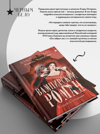 Перед вами дело преступницы и шпионки Клары Остерман. Главная улика против неё — личные дневники. В них Клара подробно описала отношения с загадочным вампиром и чудовищные эксперименты своего отца. «Не передать словами чувства, что испытываешь, когда тебе говорят, что ты не человек». «Вампирский роман Клары Остерман» — новое событие в мире Золотых земель Ульяны Черкасовой. Живые яркие герои, детектив, магия и загадочные создания, альтернативный мир, вдохновлённый Российской империей XVIII века. В романе вы встретите уже знакомых героев «Его забрал лес» и с головой пуститесь в полное опасностей расследование. Готический young adult роман понравится поклонникам «Дракулы» Брэма Стокера, «Призрака Оперы» Гастона Леру и сериала «Карамора» Троп «от ненависти до любви». Издание оформлено в виде записок, вырезок из газет, на страничках — чернильные капли и маленькие рисунки Клары. В иллюстрировании издания приняли участие Вельга Северная, Anne Svart и Дарья Кузовкова.