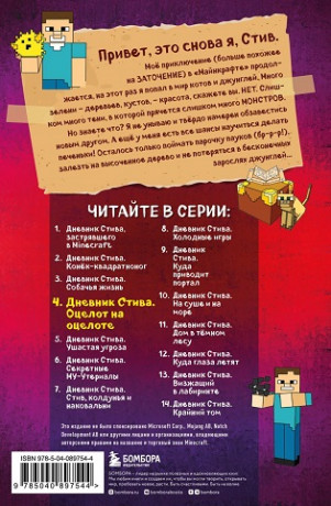 Приключения Стива продолжаются! Он попал в очередной мир в «Майнкрафте» — мир котов и джунглей! Красота, скажете вы, — но нет, вокруг слишком много тени, в которой прячется слишком много монстров. Но Стив не унывает и твёрдо намерен обзавестись новым другом. А ещё у него есть все шансы научиться делать печеньки! Осталось только поймать парочку пауков (бр-р-р!), залезть на высоченное дерево и не потеряться в бесконечных зарослях джунглей… Приготовьтесь! Вас ждут тонны шуток, обалденные приключения, коты и море веселья! Внутри книги есть пространство для творчества, где читатель может рисовать и составить собственный план по спасению Стива!