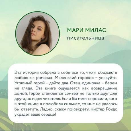 ОТ АВТОРА РОМАНОВ «ВИННИПЕГСКАЯ СТЕНА И Я» И «ОТ ЛУКОВА С ЛЮБОВЬЮ» После тяжелого разрыва и смерти матери Аврора дель Торро решает начать жизнь с чистого листа. Она возвращается в родной городок в штате Колорадо. Арендодатель Авроры, мистер Тобиас Роудс, кажется, невзлюбил ее с первого взгляда. Он живет со своим сыном-подростком и не жалует посторонних. Но с течением недель, совместных вечеров у камина и долгих бесед между Тобиасом и Авророй появляются чувства. Смогут ли их израненные сердца снова обрести счастье?