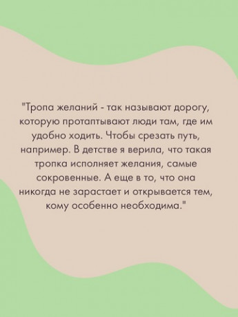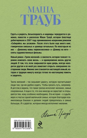 Роман «Тропа желаний» написан в традиционной для Маши Трауб манере, где все события происходят в гармоничном единстве времени и пространства. В данном случае — доме, считавшемся заброшенным, но ставшим надежным кровом для молодой женщины и ее маленького сына. Какая беда привела их сюда, какие события заставили скрываться? Эту тайну решили разгадать соседки — уже немолодые женщины, оставшиеся одинокими. Именно их неравнодушие, как и других героев романа, приведет эту историю к счастливому финалу, а «тропа желаний» действительно окажется счастливой. Роман рассказывает о том, что в самые тяжелые времена можно встретить участие, заботу и доброту там, где их совсем не ждешь. И когда уже отчаялся и потерял веру. Маша Трауб написала роман с хеппи-эндом — о том, как любовь и верность способны преодолеть любые преграды. И, как всегда в прозе писательницы, в этой истории много доброго юмора.