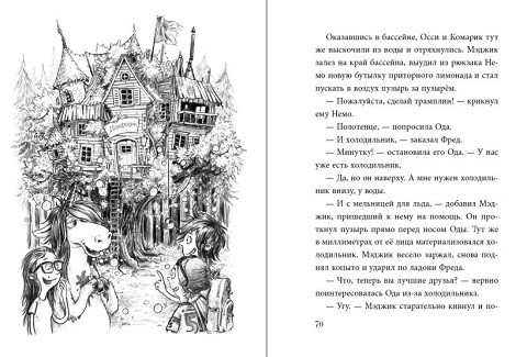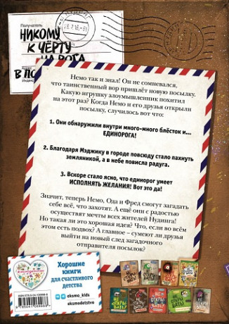 Пятая книга международной серии-бестселлера — только в России продано более 300 000 экземпляров! Увлекательная история с детективным сюжетом и стильными черно-белыми иллюстрациями. Эта книга создана для тех, кто считает, что читать — это скучно. Оно не оставит никаких сомнений, что с книгами можно классно проводить время: подтверждено сотнями положительных отзывов родителей! Новая посылка уже здесь! Немо, Ода и Фред так и знали, что таинственный вор объявится снова! На этот раз он прислал посылку, усыпанную блёстками. Когда друзья открыли её, они обнаружили внутри живого ЕДИНОРОГА! У Мэджика разноцветная чёлка, из-за него в городе повсюду стало пахнуть земляникой, а ещё он легко исполняет желания! Ребята не могут поверить своему счастью: неужели им наконец повезло и ожившая игрушка не доставит им никаких неприятностей?! Теперь они смогут пожелать себе что угодно! Но что, если во всём этом есть подвох? Может быть, Мэджик не так прост, как кажется? И получится ли у Немо и его друзей выйти на новый след отправ