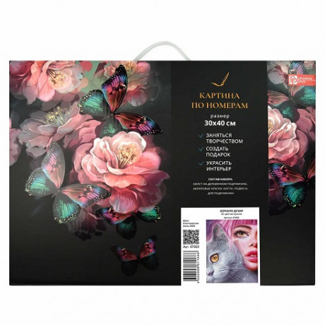 Набор для творчества Картина по номерам арт. 67925 / 24 ЗЕРКАЛО ДУШИ, размер: 30х40 см, (20 цвета (-ов), холст на деревянном подрамнике с напечатанной схемой рисунка, контрольный лист с нанесенной схемой, краски акриловые на водной основе (упакованы в вакуумную упаковку), кисти художественные с ворсом из нейлона – 4 шт., подвесы для подрамника, пакет на zip-молнии, лак в комплекте, картонная коробка с ручкой)