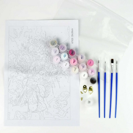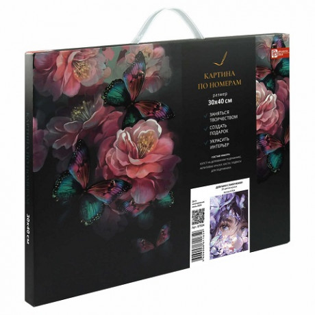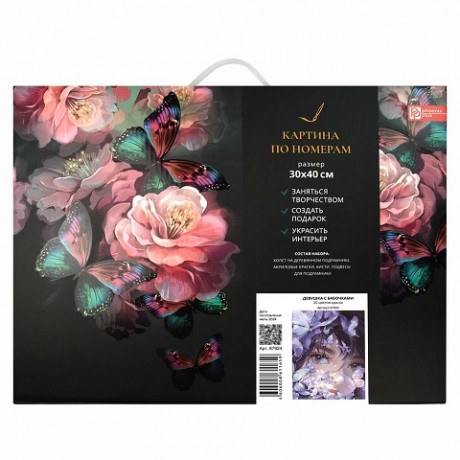 Набор для творчества Картина по номерам арт. 67924 / 24 ДЕВУШКА С БАБОЧКАМИ, размер: 30х40 см, (20 цвета (-ов), холст на деревянном подрамнике с напечатанной схемой рисунка, контрольный лист с нанесенной схемой, краски акриловые на водной основе (упакованы в вакуумную упаковку), кисти художественные с ворсом из нейлона – 4 шт., подвесы для подрамника, пакет на zip-молнии, лак в комплекте, картонная коробка с ручкой)