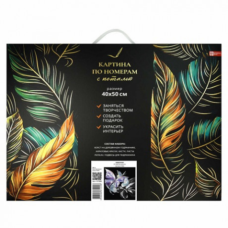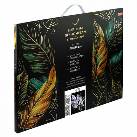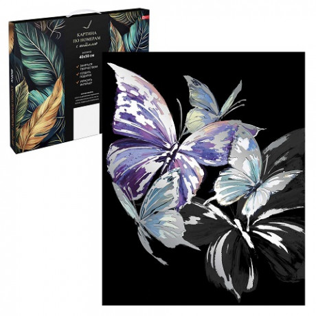 Набор для творчества Картина по номерам с поталью арт. 67988 / 16 БАБОЧКИ, размер: 40х50 см, (18 цвета (-ов), холст на деревянном подрамнике с напечатанной схемой рисунка, краски акриловые на водной основе (упакованы в вакуумную упаковку), кисти художественные с ворсом из нейлона – 4 шт., поталь, клей для потали, лак, пакет на zip-молнии, подвесы для подрамника, контрольный лист с нанесенной схемой в комплекте, поталь: серебряная, картонная коробка с ручкой)