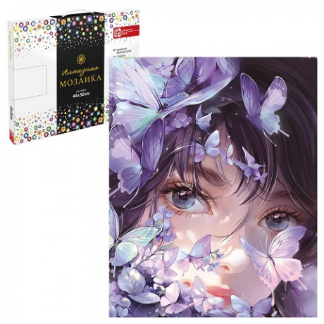 Алмазная мозаика арт. 68647 / 16 ДЕВУШКА С БАБОЧКАМИ, размер: 40*50 см, (19 цветов страз, холст на подрамнике с напечатанной картиной, покрытый клеевым слоем и защитной пленкой, пакеты со стразами, стилус, лоток для страз, силикон для страз, клей, подвесы для подрамника, пинцет металлический, схема, дополнительные пакеты с zip-молнией, стикеры для нумерации zip-пакетов в комплекте, форма страз: круглая, тип выкладки: полная, картонная коробка)