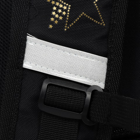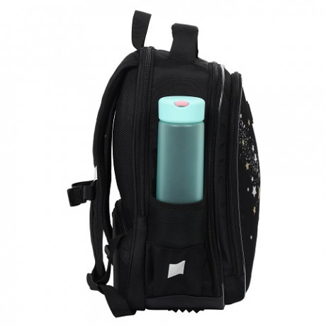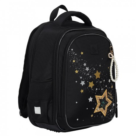 Лёгкий, компактный и вместительный школьный ранец серии Comfort light, размером 38*27*16 см. Ранец рассчитан на рост от 128 до 170 см. Выполнен из высококачественного, износостойкого и влагоотталкивающего материала. Модель имеет эргономичную вентилируемую спинку, регулируемые лямки, нагрудную застёжку. Ранец состоит из двух отделений на молнии. В основном отделении предусмотрены разделители для учебных пособий, карман для пропуска. Модель имеет четыре внешних кармана: один большой на молнии, который включает в себя органайзер для письменных принадлежностей, два боковых кармана на резинке и потайной карман на спинке. Дно выполнено из водонепроницаемого материала и оснащено прорезиненными ножками для устойчивости. Световозвращающие вставки на лямках, передней и боковых частях ранца обеспечивают безопасность ребёнка в тёмное время суток. Отделка: термопечать, печать золотой и серебряной фольгой, декоративный элемент аппликация - звезда. Вес ранца 930 г.