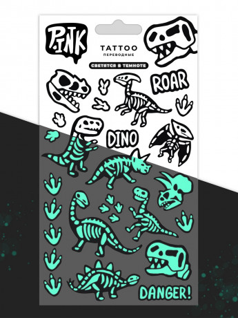 Наклейки-тату переводные 110*200 "Скелеты динозавров" светящиеся, ПИНК-150/1/10