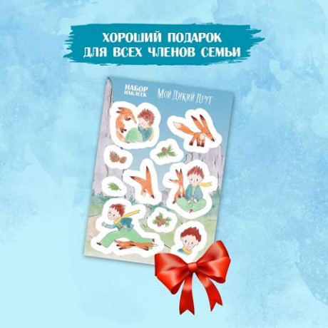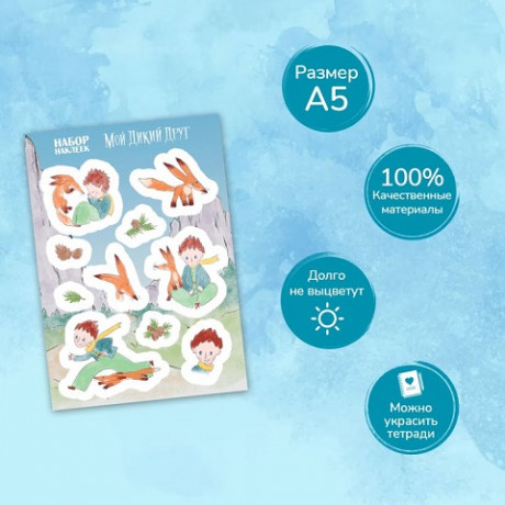 Набор наклеек с Маленьким принцем и Лисом. Они проведут вас в волшебный мир Экзюпери. Размер А5 (148х210 мм). Стикерпарк изготовлен из качественных материалов, благодаря чему наклейки долго не выцветут и не потеряют товарный вид. Самоклеящаяся пленка не рвется, а наклейки легко отделяются от фона.