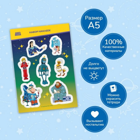 Космический набор наклеек по научно-фантастическому мультфильму «Тайна третьей планеты». Большие и маленькие любители далеких-далеких галактик останутся в восторге. Внимание! Набор наклеек вызывает ностальгию. Рекомендуем дарить детям и взрослым всех возрастов. Размер А5 (148х210 мм). Стикерпарк изготовлен из качественных материалов, благодаря чему наклейки долго не выцветут и не потеряют товарный вид. Самоклеящаяся пленка не рвется, а наклейки легко отделяются от фона.