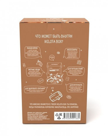 Каждая коробочка милоты наполнена необычными вещицами, которыми будет приятно пользоваться в повседневной жизни: милая канцелярия, уютные товары для дома, стильные аксессуары, предметы для здорового образа жизни и приятные мелочи. Внутри Milota BOX находится до 8 сюрпризов, упакованных в стилизованную подарочную бумагу тишью. Коробочка из плотного, дизайнерского картона. Размер коробочки: 22 х 14 х 9 см.
