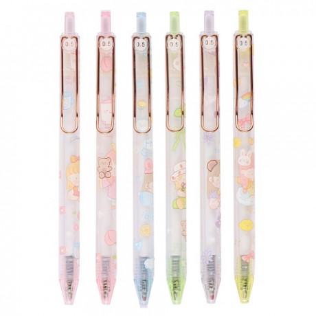 упаковка дисплей корпус круглый вид автоматическая наконечник пластиковый цвет чернил черный пишущий узел 0,5 мм тип стержня гелевая цвет корпуса рисунок длина сменного стержня 110 мм материал корпуса пластик ассорти 6 видов