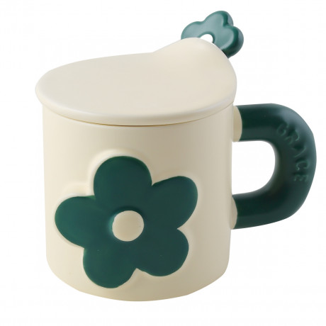 Кружка керамическая 400мл крышка, ложка "Цветок" КОКОС зеленый 252571/1