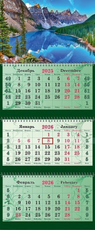 Календарь квартальный 340х810мм.гребень 3бл.2026 Полином "СУПЕРПРЕМИУМ.Пейзаж с синим озером"2406-36