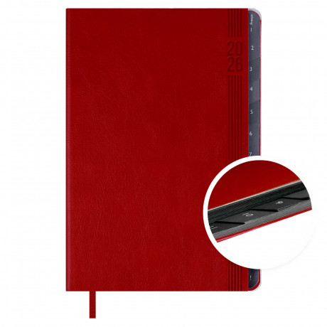 Еженедельник датированный 2026 ESCALADA, 170х88 мм, 64 л., арт. 70377/ 40 ДЖУТ КРАСНЫЙ (кожзам: твёрдый переплёт с поролоном, материал обложки: искусственная кожа "Джут"; декор: блинтовое тиснение; способ крепления блока: ниткошвейный; вн. блок: 64 л., белый офсет 70 г/м², печать в две краски (линия), справочный материал: есть; перфорация углов блока: нет; закладка/-и: одно ляссе; каптал: есть; форзац: без печати; персонализация возможна: да; индивидуальная упаковка: ПЭТ-пакет)