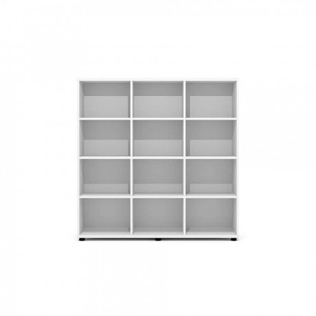 Внутреннее пространство стеллажа разделено двумя перегородками на три равные секции. Каждая секция разделена тремя стационарными полками, установленными на скрытые полкодержатели. Двенадцать секций стеллажа имеют равные габариты – 452х356х327 мм и могут быть дополнены боксами R-84, R-85 или R-86.
