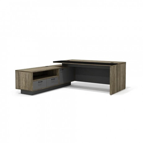 Столешница и опоры стола руководителя имеют толщину 36 мм; топ, задняя стенка и перегородка тумбы выполнены из материала толщиной 25 мм, основание и полка тумбы – 18 мм, остальные детали – 16 мм. Стол руководителя снабжен лотком для укладки сетевых фильтров и блоков питания оргтехники, бюваром, обтянутыми черной экокожей. Выходы лотков на плоскости столешницы закрыты двумя квадратными заглушками со съемными крышками, выполненными из матового черного пластика. Ящики тумб устанавливаются на скрытые направляющие. Стол состоит из столешницы, установленной на опорную тумбу с левой стороны и боковую опору – с правой. Кабинет руководителя Bruno сочетает удобство и функциональность элементов с практичностью и актуальностью материалов. Рабочие столы руководителя снабжены кабель-менеджментом для скрытого подключения техники, что обеспечивает эстетичный вид рабочего места. Современный лаконичный облик кабинета подчеркивают актуальные древесные цвета каркасов и столешниц «Делиос», в сочетании с антрацитовыми фасадами тум