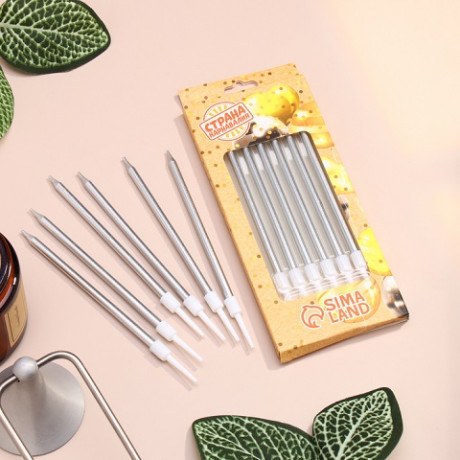 Свечи в торт коктейльные "Шайн", 6 шт, 10 см, серебряный металлик 7582963/1/400