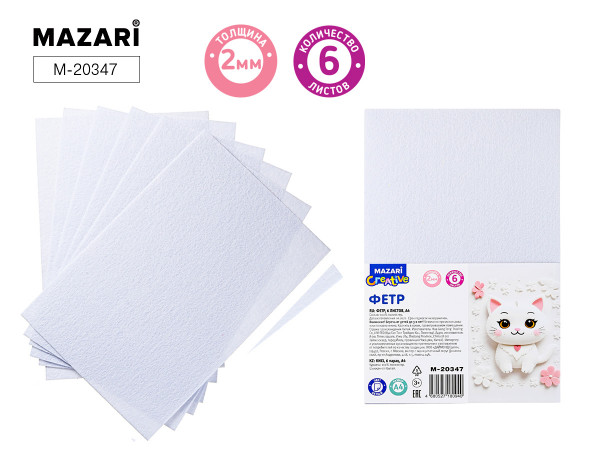 Набор фетра А4 MAZARI белый 6 л. 2 мм. M-20347/1/10