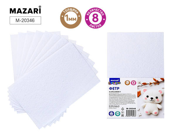 Набор фетра А4 MAZARI белый 8 л. 1 мм. M-20346/1/15