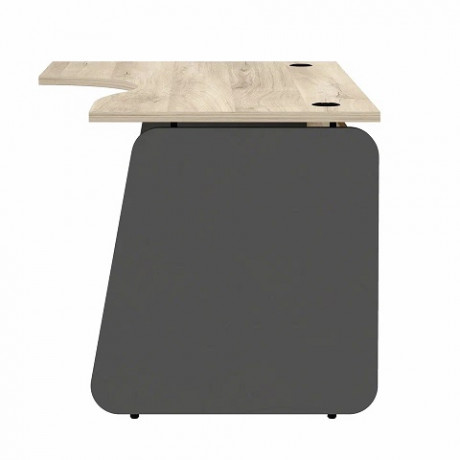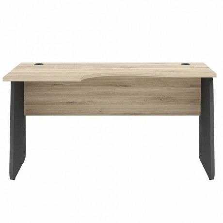Столешница и царга стола выполнены из древесно-стружечной плиты, облицованной пленкой цвета «Дуб Кронберг» на основе термореактивных полимеров в тиснении «шагрень». Опоры стола выполнены из древесно-стружечной плиты, облицованной пленкой цвета «антрацит» на основе термореактивных полимеров в тиснении «шагрень». Толщина материала столешницы и опор – 25 мм,царги – 18 мм. Столешница стола имеет эргономичную форму с криволинейной рабочей стороной. Радиус скругления рабочей зоны стола – плавный переменный 300 и 600 мм. Опоры стола имеют трапециевидную эргономичную форму с наклонной на 10° внутренней стороной и скругленными углами. Радиус скругления углов – 70 мм. Эргономичный переход (криволинейный вырез) столешницы, скругление углов и трапециевидная обработка опор выполнены исключительно механическим способом на высокоточном оборудовании. Детали стола отторцованы противоударной кромкой на основе поливинилхлоридной смолы в цвет материала толщиной 2 мм.