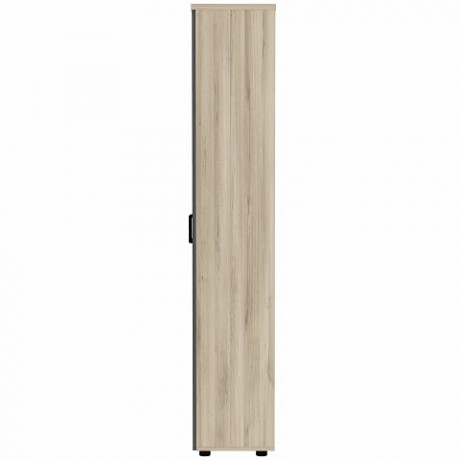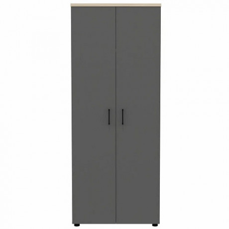 Кабинет руководителя Bruno сочетает удобство и функциональность элементов с практичностью и актуальностью материалов. Современный лаконичный облик кабинета подчеркивают актуальные древесные цвета каркасов и столешниц «Делиос», в сочетании с антрацитовыми фасадами тумб и шкафов. Дизайн и цветовые решения коллекции Bruno дают возможность комбинировать ее элементы с мебелью для персонала Line, поэтому вы сможете выполнить в едином стиле рабочее пространство всего офиса. Толщина материала топа и полок – 25 мм, остальных деталей корпуса – 18 мм, фасадов – 16 мм. Внутреннее пространство шкафа разделено перегородкой на две разноширинные секции. Левая секция шириной 460 мм снабжена стационарной полкой для головных уборов и выдвижной штангой для одежды. Правая секция шириной 284 мм снабжена четырьмя стационарными полками.