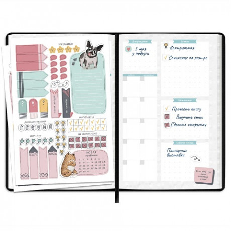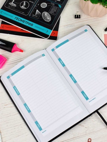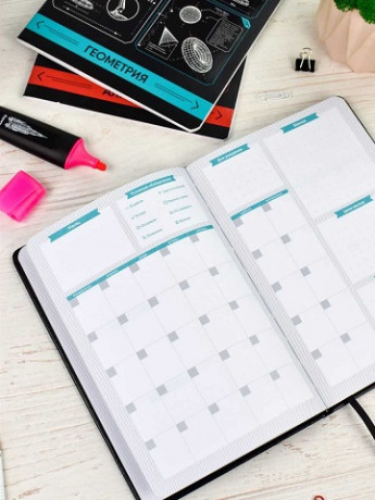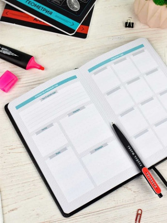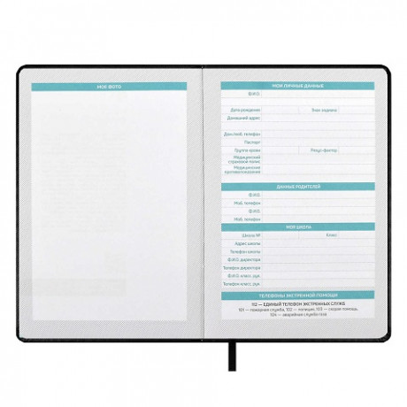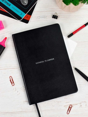 Планинг школьный арт. 66495 / 15 ПЛОНЖЕ ЧЁРНЫЙ (кожзам: А5; твёрдый переплёт, материал обложки: искусственная кожа "Плонже"; декор: тиснение фольгой; способ крепления блока: ниткошвейный; вн. блок: 80 л., белый офсет 70 г/м², печать в две краски, справочный материал: есть; закладка: одно ляссе; форзац: печать пантоном; особенности: 2 листа с наклейками в комплекте, карман на форзаце; индивидуальная упаковка: промостикер + ПЭТ-пакет)