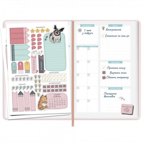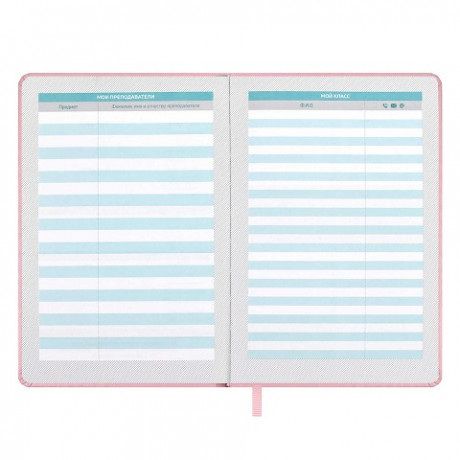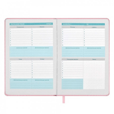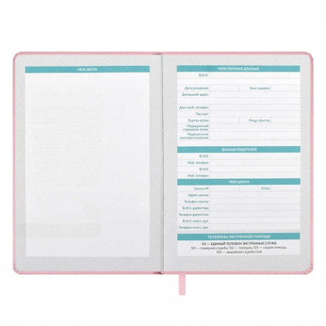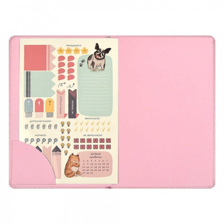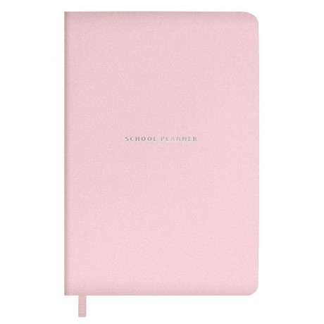 Планинг школьный арт. 66489 / 15 ПЛОНЖЕ РОЗОВЫЙ (кожзам: А5; твёрдый переплёт, материал обложки: искусственная кожа "Плонже"; декор: тиснение фольгой; способ крепления блока: ниткошвейный; вн. блок: 80 л., белый офсет 70 г/м², печать в две краски, справочный материал: есть; закладка: одно ляссе; форзац: печать пантоном; особенности: 2 листа с наклейками в комплекте, карман на форзаце; индивидуальная упаковка: промостикер + ПЭТ-пакет)