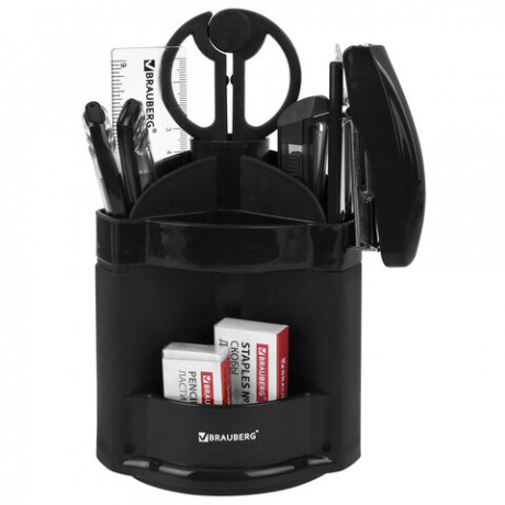 Готовый набор с наполнением. Устойчивая и вместительная подставка изготовлена из высококачественного пластика. В комплекте 14 предметов: 2 ручки, 2 карандаша, линейка, точилка, ластик, 30 скрепок, степлер №10, 1000 скоб, антистеплер, ножницы, нож канцелярский, блок бумаги для записей. Наполнение может отличаться от представленного.