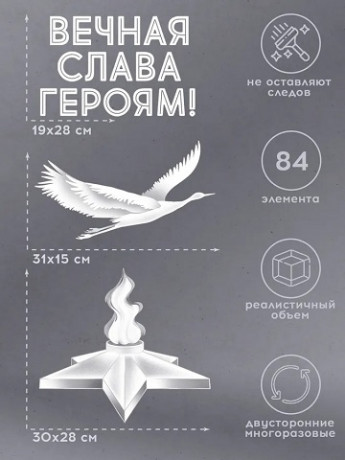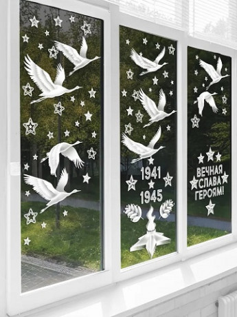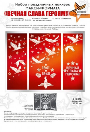 Набор декоративных наклеек большого формата идеально подойдет для украшения окон или витрин магазинов к такому значимому для каждого россиянина празднику как День Победы. Они многоразовые, двусторонние, выглядят стильно и реалистично. Материал изделия ПВХ, отделка – белила. Формат А1, размеры 970х664 мм