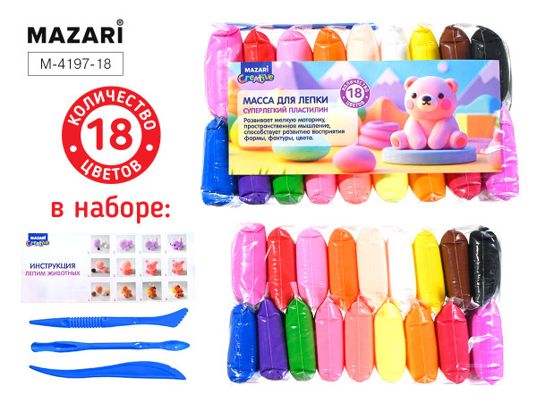Mасса д/лепки "MAZARI" 18цв. по 13г, со стеком, 3шт, M-4194-18/1/20/80 M-4194-18/1/20/80