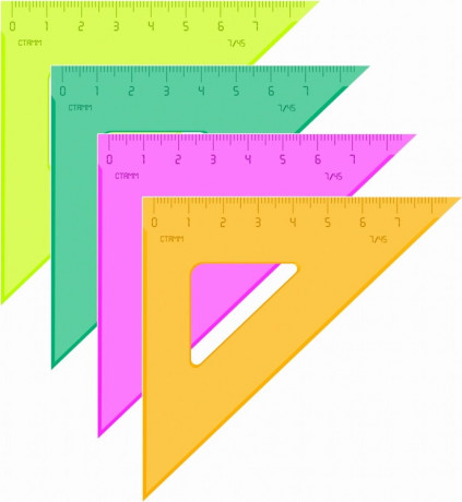 Треугольник 45 градусов 7см с чёткой печатной миллиметровой шкалой. Гладкая глянцевая поверхность. Цвет: 3 ярких цвета ассорти (прозрачные). Штрих-код на единице изделия. Материал: сертифицированный полистирол.